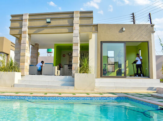 To ensure convenience our facilities at Forefront Apartments includes a Gym & a Swimming Pool for guests. An outdoor bar for guests to entertain themselves is available. Drinks and other bar requirements for consumption are supposed to be sourced by the guests themselves. A braai area is also available on site. For peace of mind 24-hour security is provided including CCTV & electric fence. Power backup is available in case of power outages. Dedicated parking is available. A safe is provided in each apartment to secure valuables.